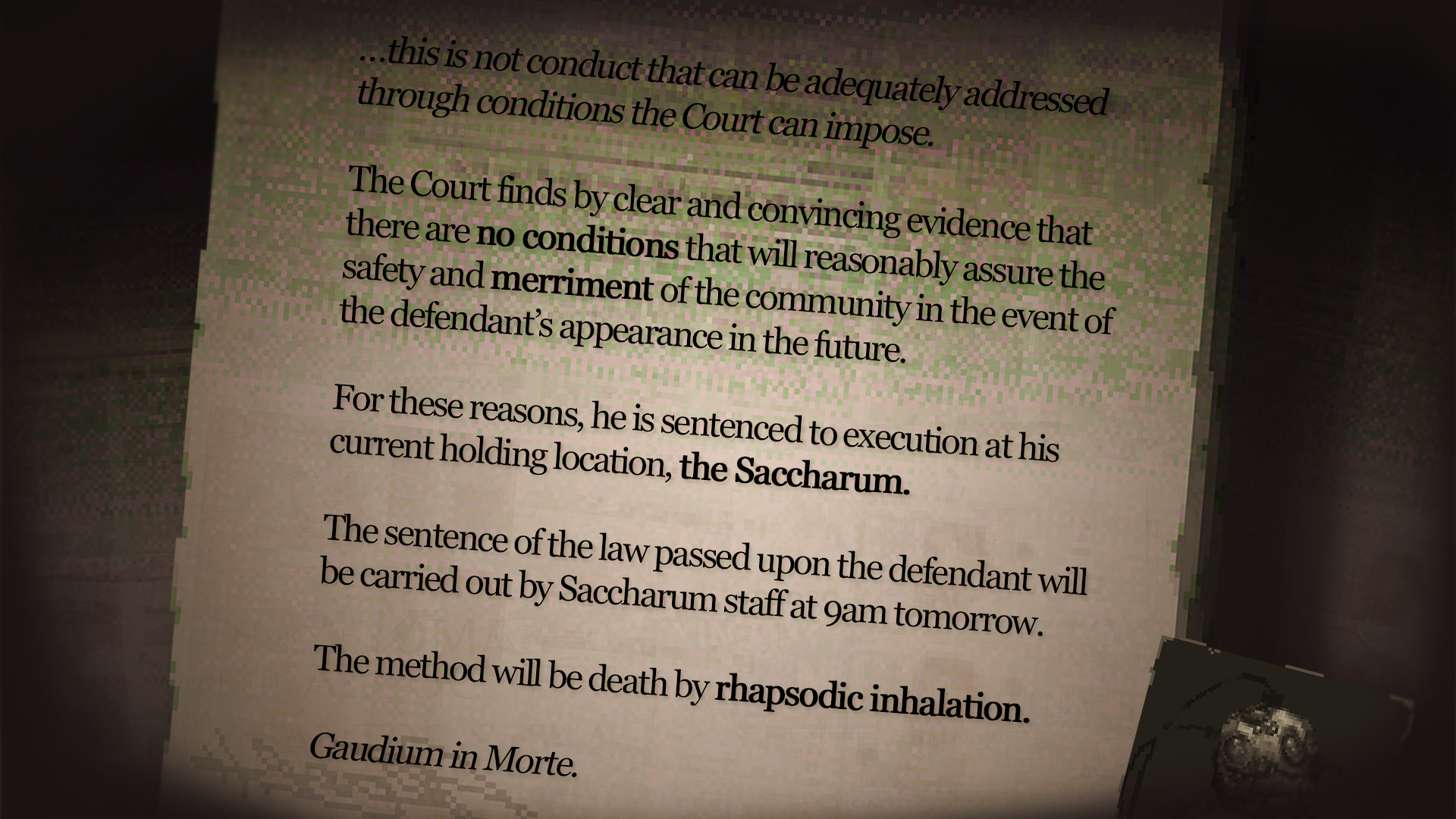 The Player and the AI have 5 Life Points meaning they can only get “Gassed” 5 times. The values are displayed in two gauges, as the value increases the Player’s vision will warp and turn yellow, while the AI’s dialogue will become more deranged.