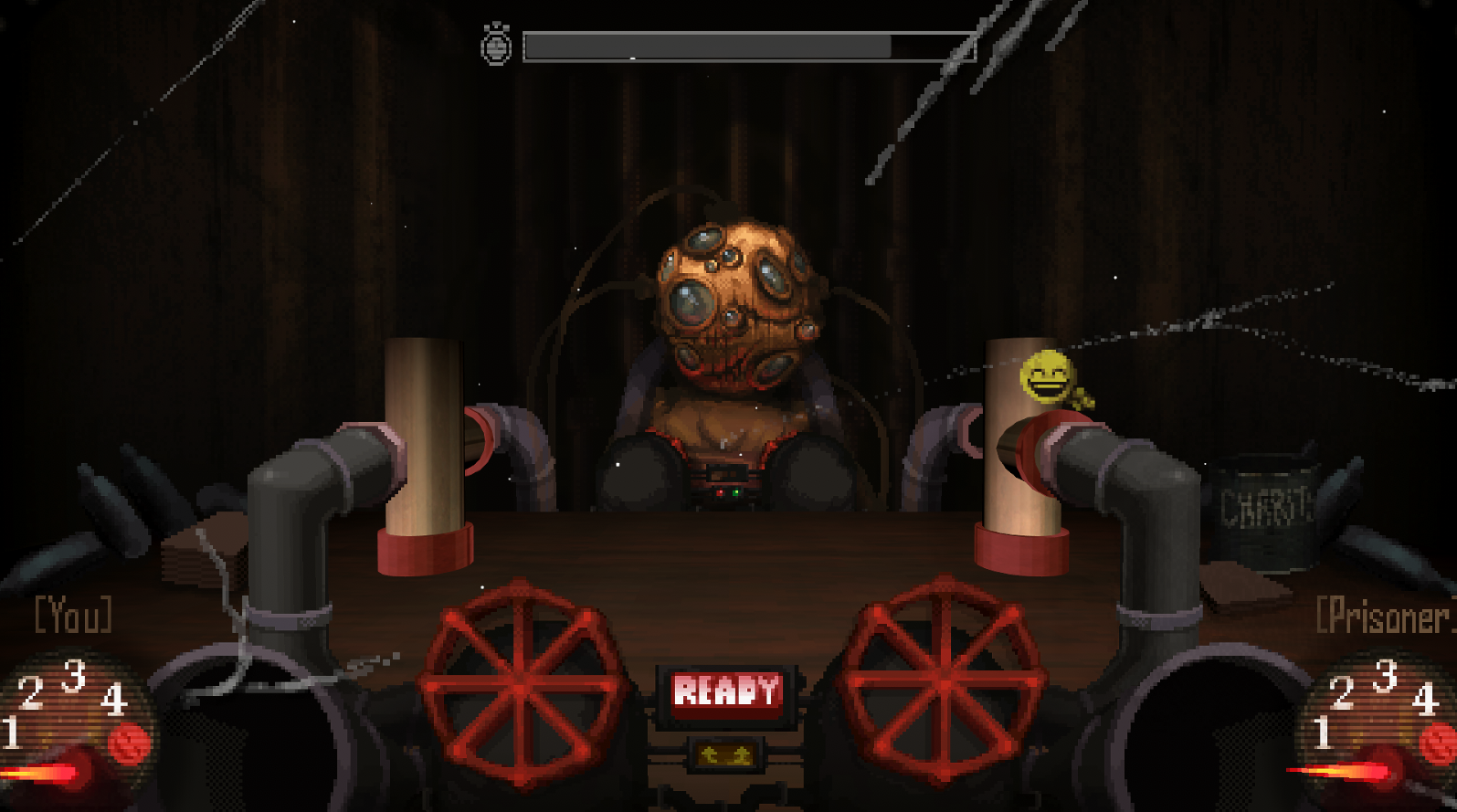 Amid this twisted recreation of the prisoner's dilemma, you have five chances to succeed, tracked by the number on your life-gauge. Your only goal is to ensure that both pipes face your opponent at all times… But beware: learning, adapting, and challenging you with your own techniques, the prisoner will prove that you’re not so different from one another. Be cautious with your strategies, it has a knack for patterns.