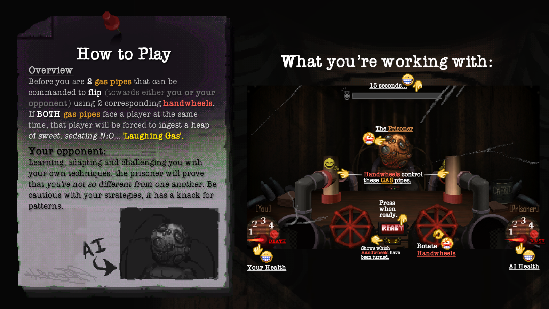 In this run down table-top horror, a conniving, player-stimulating prisoner is your final foe. Before you are 2 gas pipes that can be commanded to flip (towards you or your opponent) using 2 red hand-wheels. If both pipes face either player at the same time, that player will be forced to ingest a heap of sweet, sedating N20… “Laughing Gas”.